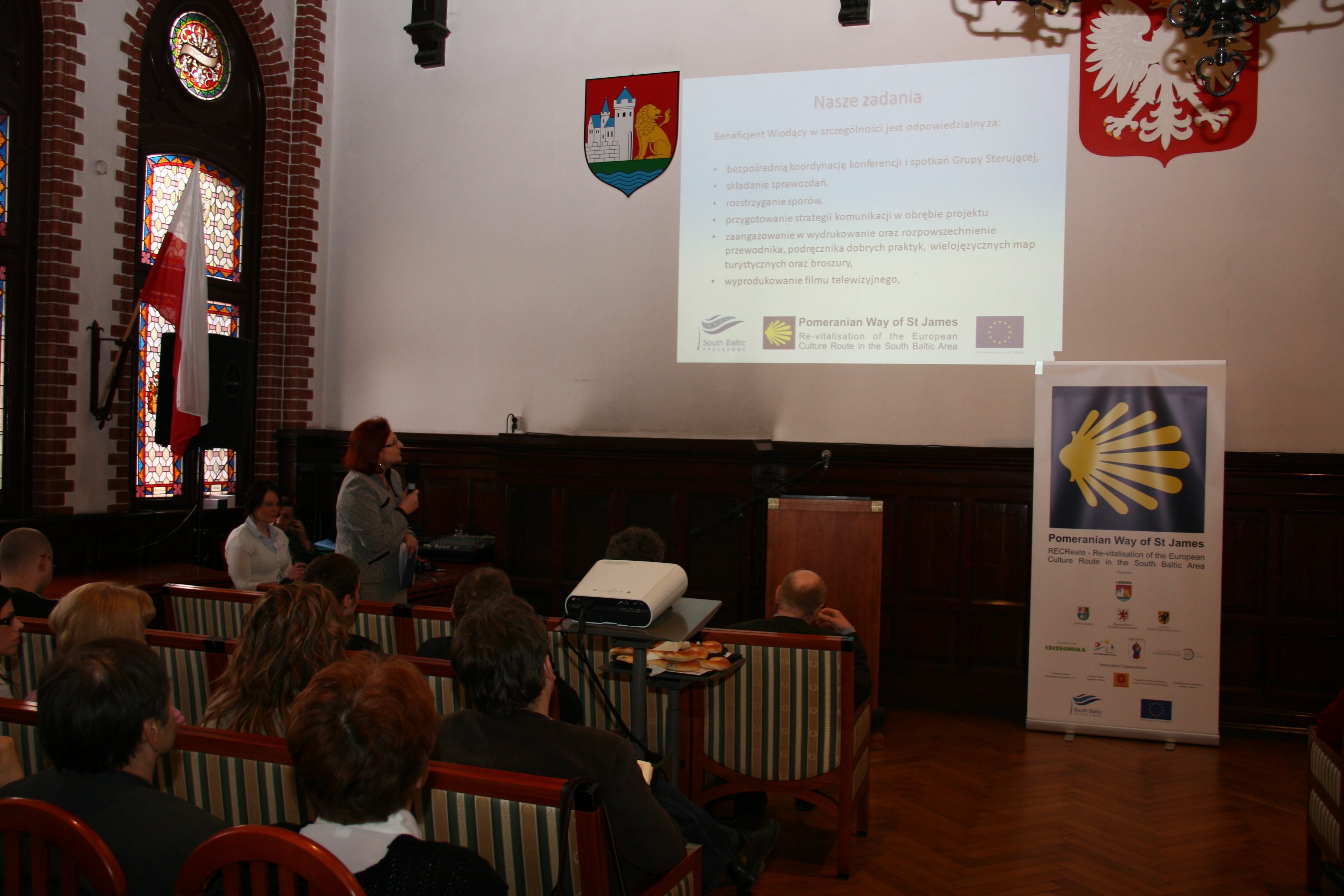 Pierwszy dzień wizyty w Lęborku to spotkanie Grupy Sterującej, podczas którego zostały podjęte decyzje odnośnie przyszłych prac partnerów projektu oraz działań w poszczególnych komponentach. Odbyła się dyskusja nt. regulaminu pracy GS oraz ustalono konieczność powołania grup roboczych przedsięwzięcia. Przedstawiony został również projekt strony internetowej poświęconej Pomorskiej Drodze Św. Jakuba.