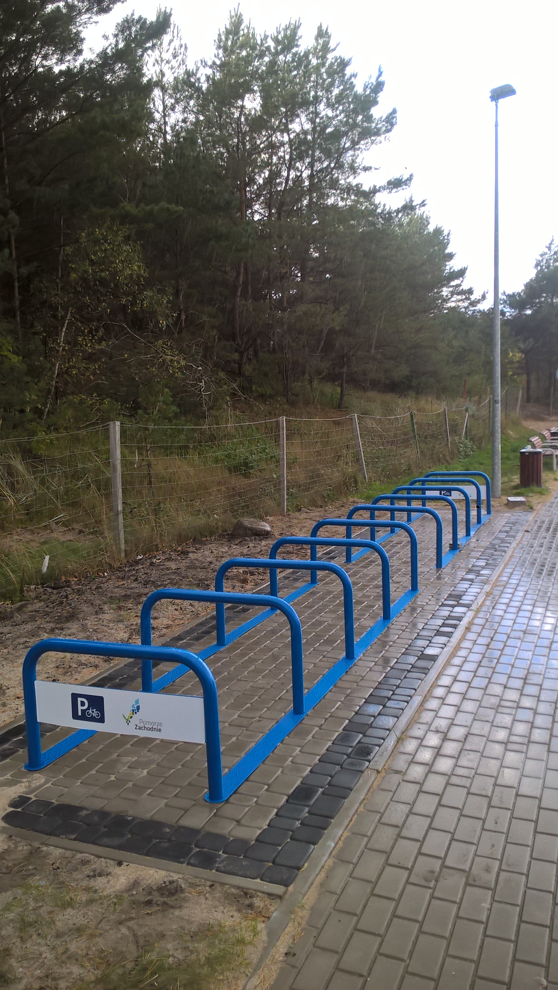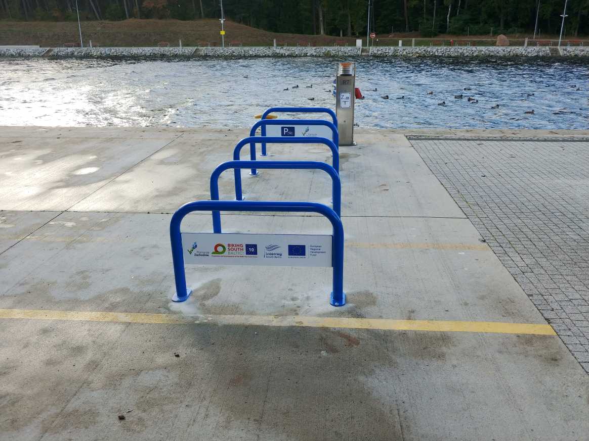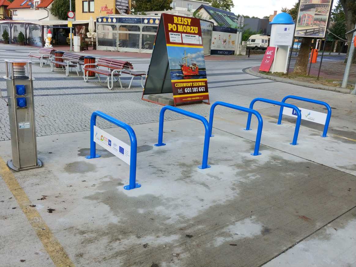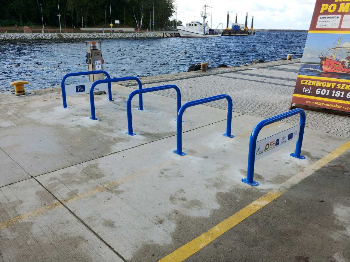 Zamontowano 15 szt. parkingów rowerowych w porcie w Mrzeżynie (10 po lewej stronie rzeki Regi, 5 po prawej stronie), 5 szt. parkingów rowerowych przy boksach rowerowych (ul. Nadmorska) w Mrzeżynie oraz 10 parkingów rowerowych przy wejściu na plażę w Rogowie.