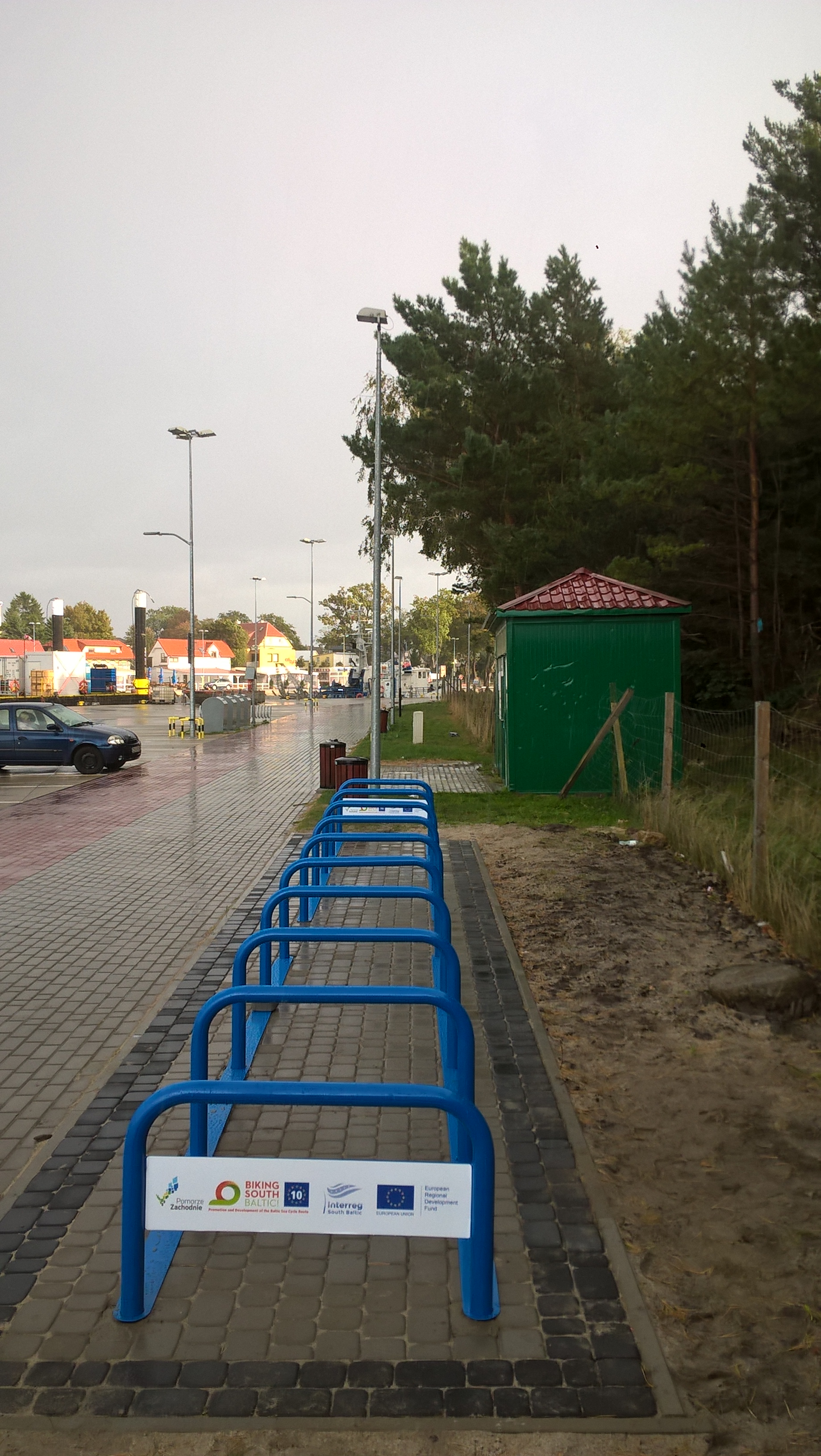 Parkingi rowerowe w porcie Mrzeżyno po prawej stronie ujścia Regi