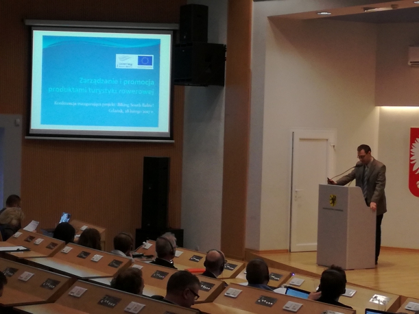Następnie w sali sesyjnej Sejmiku Województwa Pomorskiego odbyła się konferencja rozpoczynająca projekt Biking South Baltic. Podczas konferencji przedstawionych zostało wiele interesujących tematów dot. turystyki rowerowej m.in.: Europejska Sieć Szlaków Rowerowych Eurovelo - korzyści ekonomiczne, społeczne, środowiskowe, kulturalne oraz zdrowotne (Ed Lancaster, Europejska Federacja Rowerzystów), Zarządzanie turystyką rowerową, wspólpraca prywatnych firm i instytucji publicznych - model duński (Jesper Porksen, Duńska Organizacja Turystyki Rowerowej), Badania w turystyce rowerowej - w jaki sposób zbierać i analizować dane (Carl Marcussen, Regionalne Centrum Badań Turystycznych z Bornholmu), Zarządzanie i promocja produktami turystyki rowerowej (Jacek Zdrojewski, TREK).