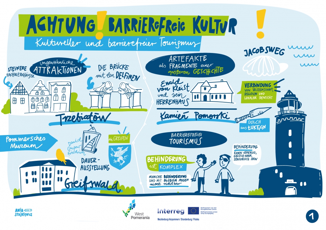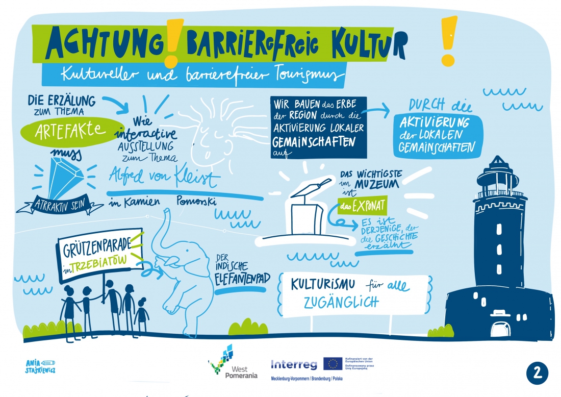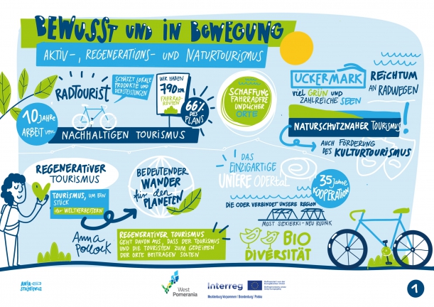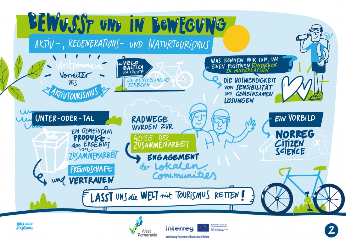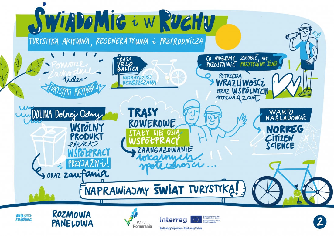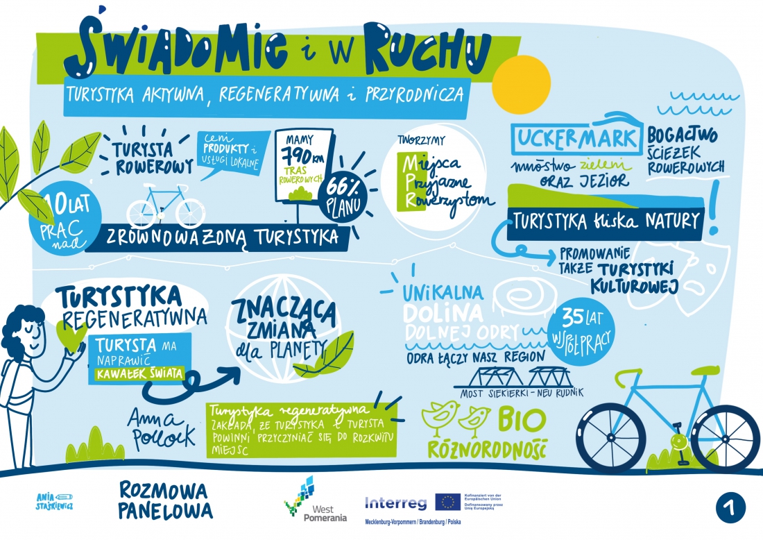 Wydarzenie zorganizowane zostało w ramach projektu programu INTERREG VI A POLSKA-NIEMCY i miało na celu zaproponowanie nowych, wspólnych rozwiązań w zakresie oferty turystycznej Euroregionu Pomerania, a także przygotowanie do nadchodzącego sezonu turystycznego. Konferencja składała się z dwóch bloków tematycznych: ,,Świadomie i w ruchu’’ oraz ,,Uwaga! Kultura dostępna’’. Polscy i niemieccy eksperci z różnych dziedzin wygłosili prezentacje, a następnie wzięli udział w dyskusji moderowanej, która była doskonałą okazją do wymiany doświadczeń, inspiracji oraz wspólnego wypracowania dalszych działań na rzecz rozwoju turystyki w naszym regionie. Pierwszy panel konferencji poświęcony był turystyce aktywnej, przyrodniczej i regeneratywnej. Drugi panel konferencji został natomiast poświęcony turystyce kulturowej oraz dostępnej.
