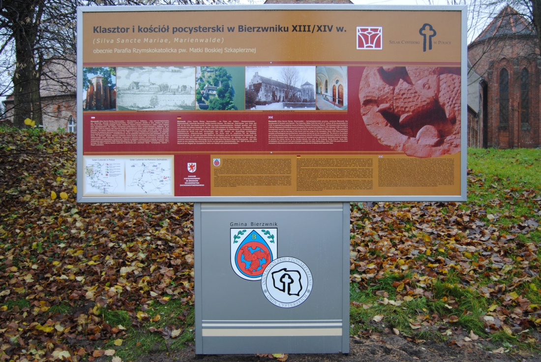 Ogólnopolskie Stowarzyszenie Gmin Cysterskich z siedzibą w Bierzwniku zrealizowało zadanie pn. "Zachodniopomorski Szlak Cysterski" dofinansowane z budżetu Województwa na rok 2010. W ramach zadania kompletem tablic informacyjnych 9 obiektów pocysterskich oznakowany został Szlak Cysterski w województwie zachodniopomorskim. Szlak pocysterski przebiega przez miejscowośći: Bierzwnik, Cedynia, Krzęcin, Marianowo, Pelczyce, Recz, Stare Czarnowo, Moryń, Węgorzyno. Na każdą gminę przypadł 1 komplet tablic informacyjnych.